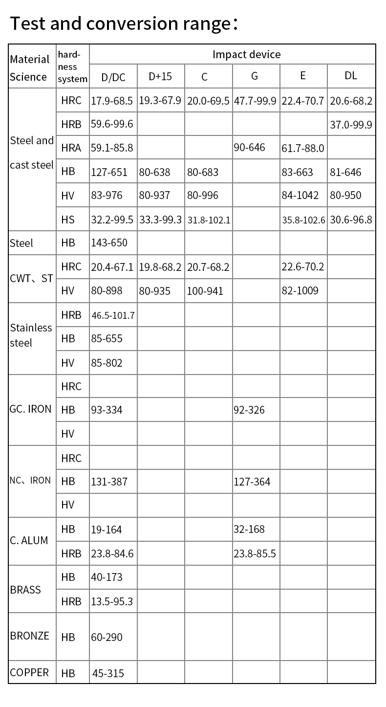 Amplio rango de medición. Puede medir la dureza de todos los materiales metálicos. Visualización directa de escalas de dureza HRB, HV, HB, HS, HL