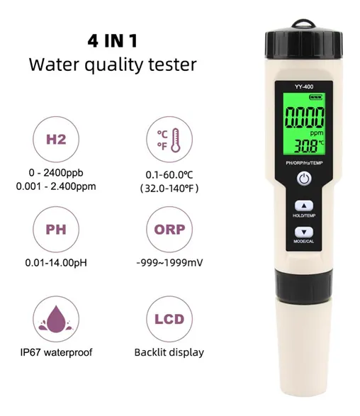 YY-400 es un probador de calidad de agua multifuncional de alta precisión, que tiene las funciones de medir el PH, ORP, concentración de iones de hidrógeno y la temperatura del agua. Los datos de medición de compensación automática de temperatura (0-60 C) se actualizan. Preciso, fácil de operar, fácil de llevar, beber un montón de agua rica en iones de hidrógeno es bueno para la salud.