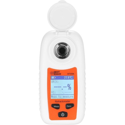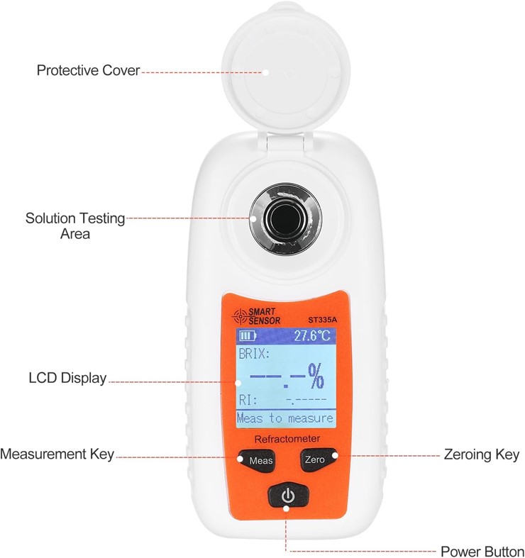 Instrumento óptico de precisión: adopta un sensor refractivo óptico de alta calidad para medir rápidamente en segundos, con una alta precisión de ±0,2 % Brix y una resolución de 0,1 %.